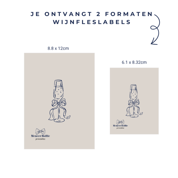 Het De liefste strik wijnlabel is een printable bestand dat je ontvangt als PDF. Op de pagina staan, 2 formaten labels. Je ontvangt beide maten, zo heb je altijd een label dat zal passen.